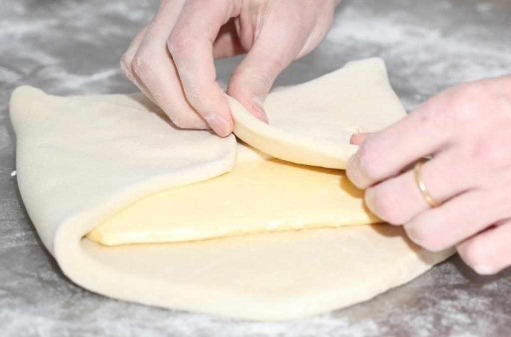 - خمیر را مثل کتاب تا کنید و دوباره با وردنه به ضخامت 5 میلیمتر باز کنید.